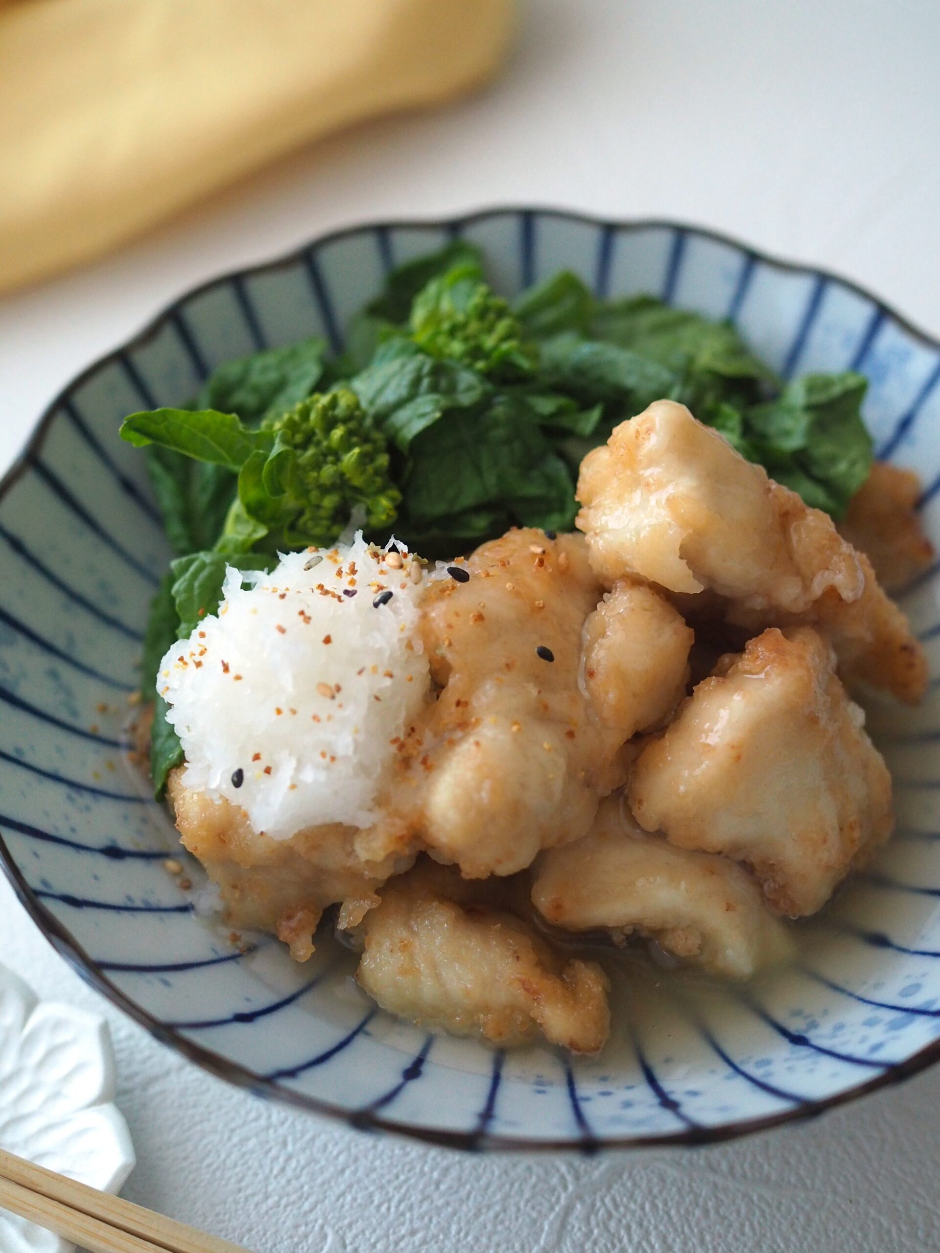 少しとろみをつけたお出汁をかけるだけで、塩唐揚げが上品な一品に変身。きのこなどを添えても◎