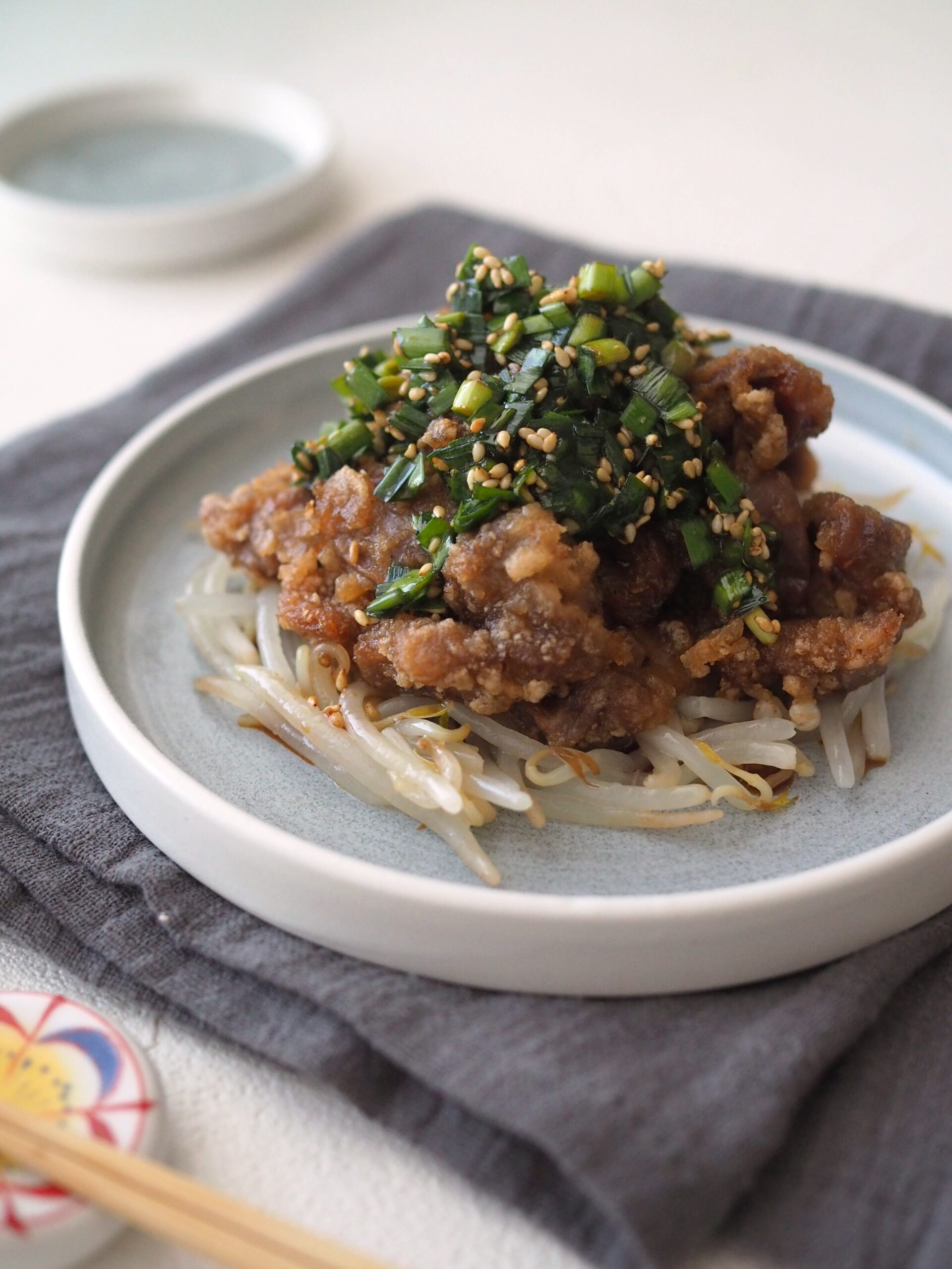 ⑤器にもやしを敷いて、上に砂肝の竜田揚げを盛り、④のタレをかけたら完成。